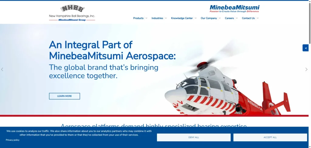 A subsidiary of MinebeaMitsumi, NHBB manufactures precision bearings and complex bearing assemblies for aerospace, defense, medical, and high-tech markets, including precision and thin-section ball bearings.